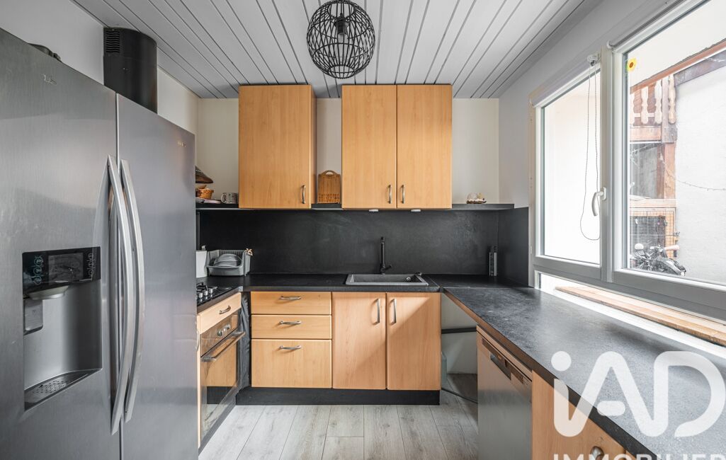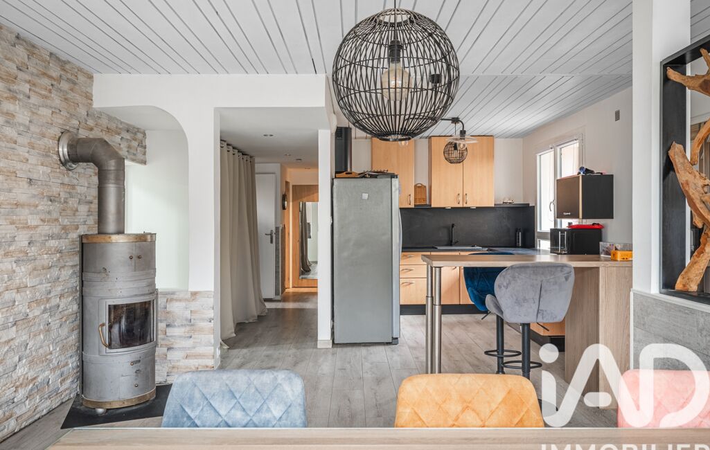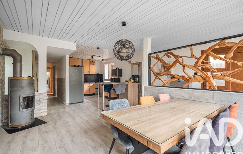 Vaste pièce de vie de 33 m² avec cuisine ouverte et poêle à bois.