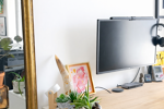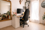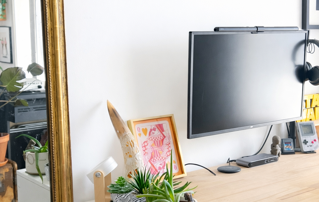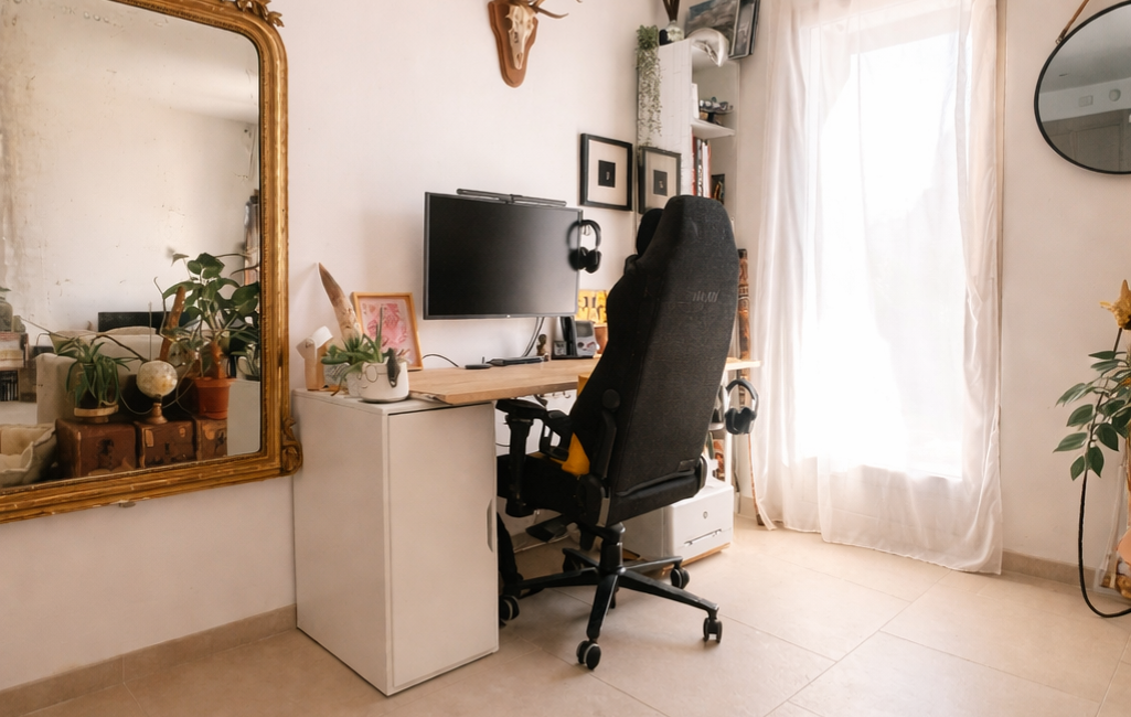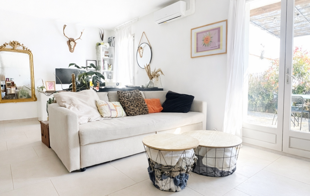Un beau salon avec espace bureau doté d’une climatisation réversible pour un confort optimal , donnant accès directement sur l’espace extérieur.
