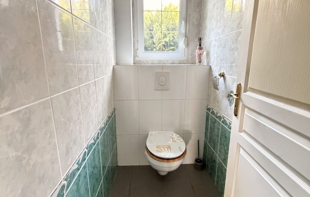Le rez-de-chaussée comprend également une chambre, une buanderie, un WC indépendant ainsi qu’une grande salle de bains avec douche et baignoire.