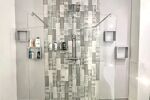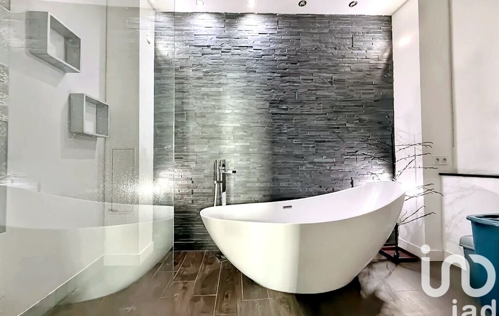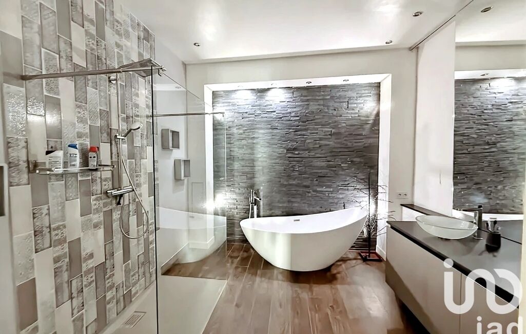 • La salle de bain moderne de 11m2, contemporaine combinant baignoire, douche à l’italienne avec un large meuble simple vasque associés à un volume et un design unique est la pièce maitresse de ce coin nuit.