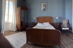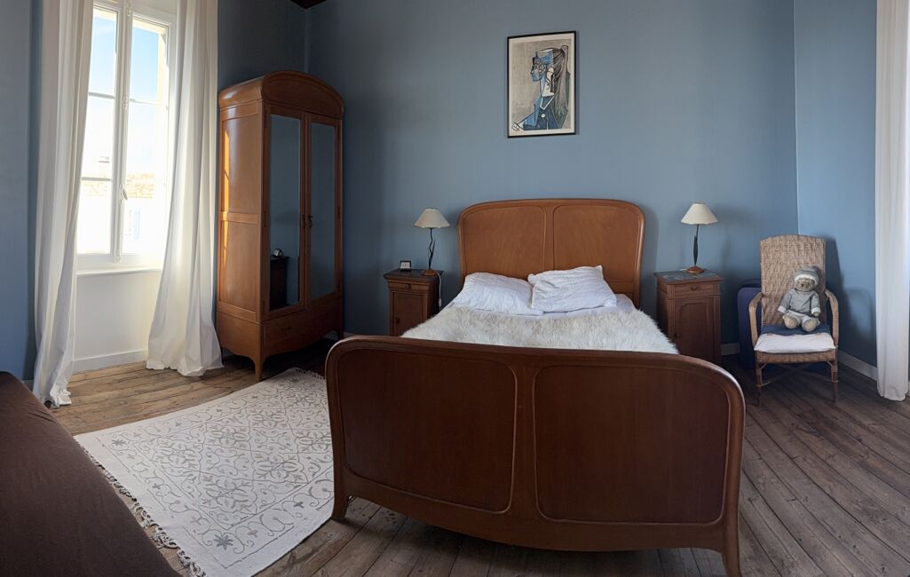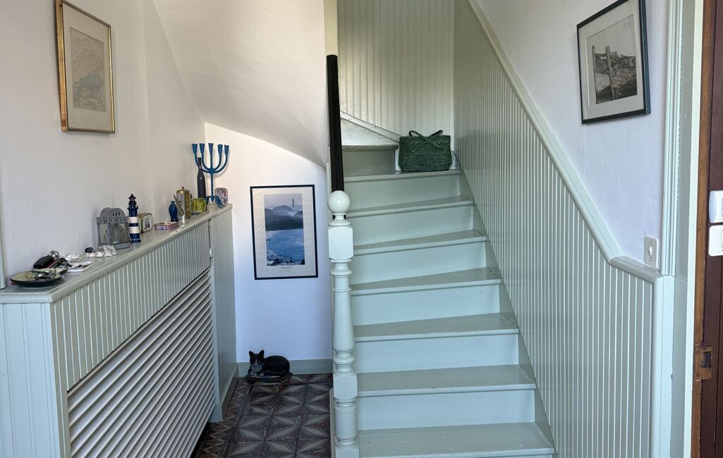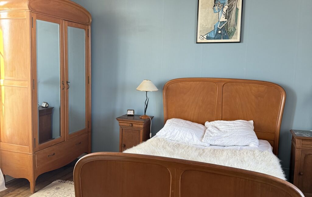 À l'étage sur un beau parquet massif, le palier distribue deux grandes chambres lumineuses doublement exposées offrant chacune une vue mer et un coin toilette.