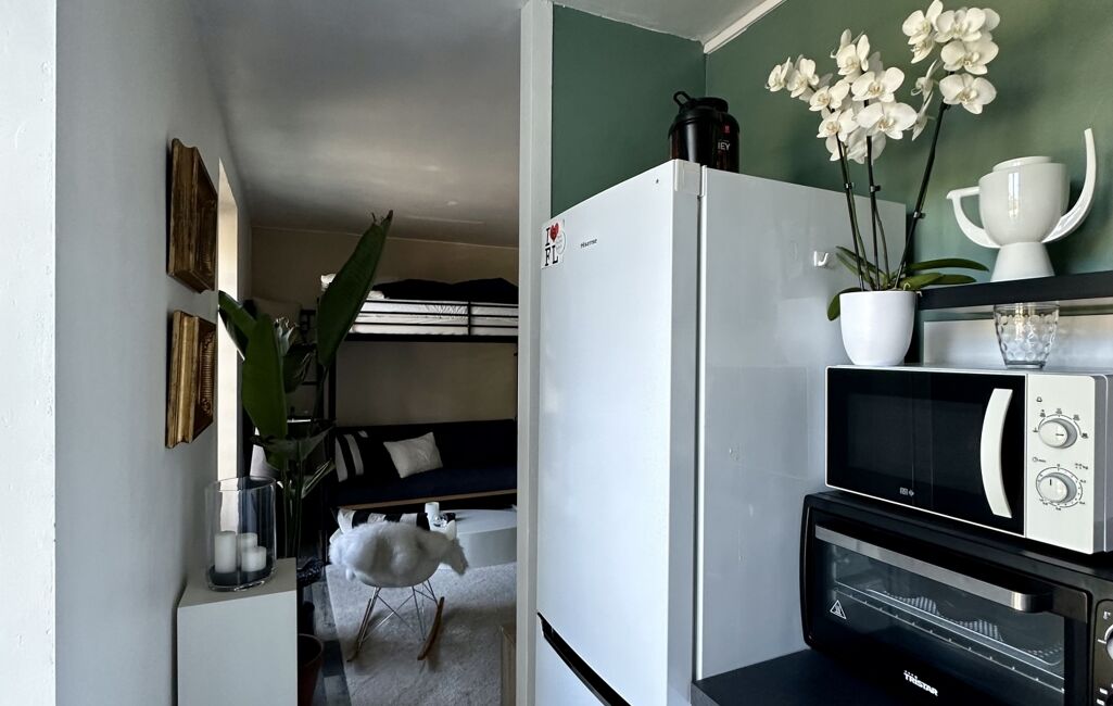 Il comprend une pièce principale spacieuse pouvant être aménagée en espace salon/salle à manger/coin nuit, une cuisine équipée et une salle d'eau avec WC, ainsi qu’un coin buanderie avec machine à laver.