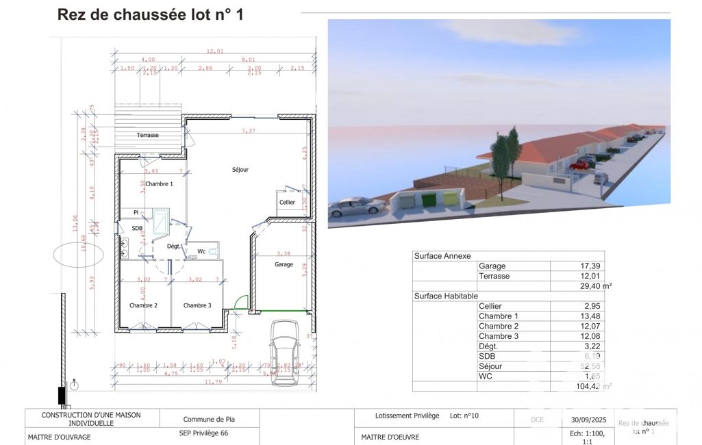 Villa 3 faces de 105m2 T4 avec garage de 17m2 sur une parcelle de 319m2 avec 2 places de parking privatives, normes RE 2020 avec climatisation gainable A/R Zone et thermodynamique.