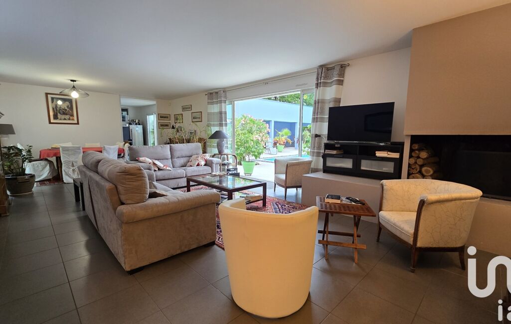 •Séjour lumineux et chaleureux avec cheminée, avec une vue sur la terrasse et piscine