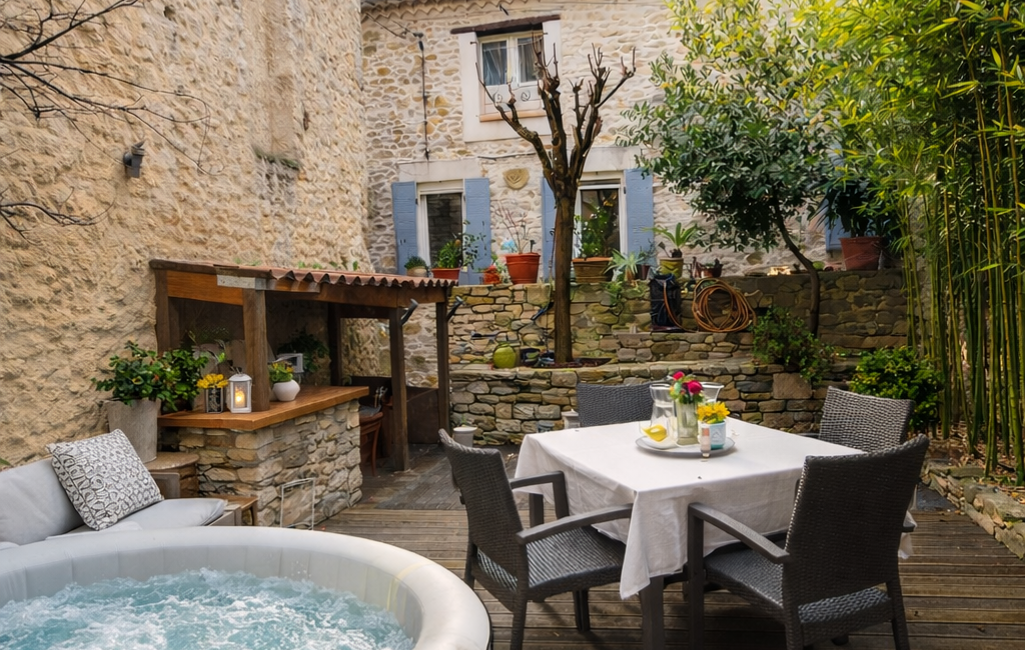 À l’extérieur, véritable coup de cOEur : deux terrasses et une cour intimiste avec cuisine d’été et jacuzzi, idéale pour profiter des beaux jours en toute tranquillité.