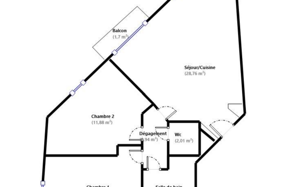 Il comprend une pièce de vie spacieuse d’environ 29 m² avec cuisine ouverte aménagée et équipée, donnant sur un balcon, deux chambres confortables d’environ 12 m², une salle de bains et un WC indépendant.