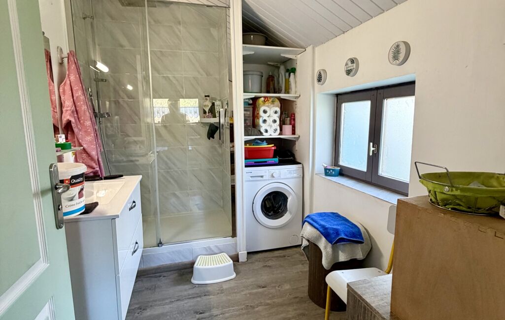 Au rez-de-chaussée, vous trouverez une entrée donnant sur un salon séjour, un cellier, un wc séparé, une salle d'eau avec douche ainsi qu'une cuisine équipée.