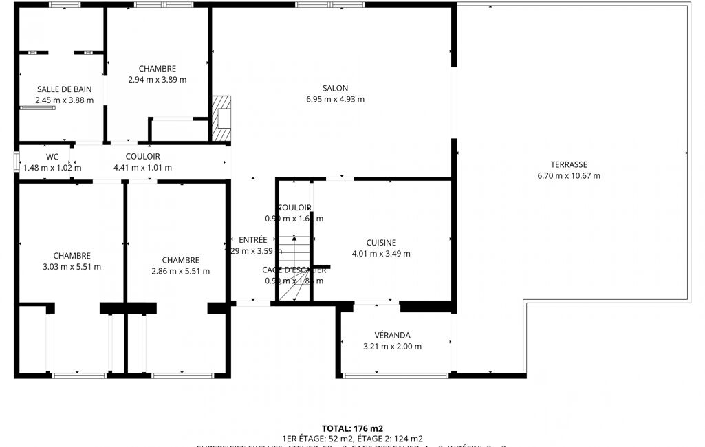 Elle se compose d’une spacieuse pièce de vie avec cheminée, d’une cuisine indépendante, de trois grandes chambres avec dressings, d’une salle d’eau et d’un WC.