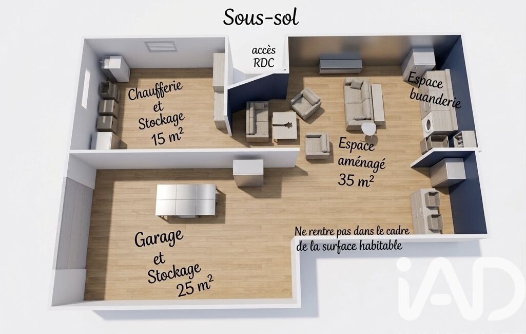 • Vous y trouverez un espace aménagé, un coin buanderie, la chaufferie, du stockage et bien sûr, un garage.