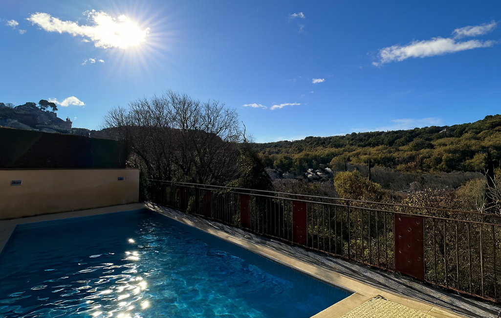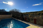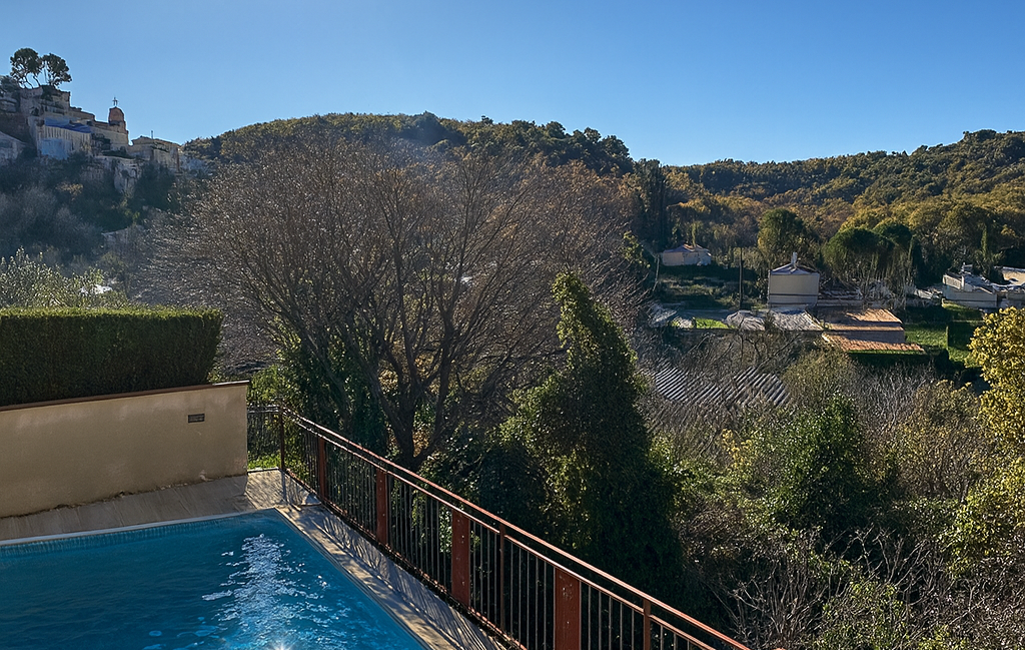 A l’extérieur, belle cuisine d’été avec terrasse et tonnelle, piscine exposée plein Sud avec vue imprenable sur le village et la nature, sans vis-à-vis.