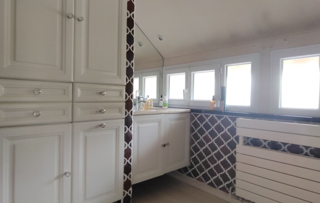 À l’étage, une mezzanine à usage de bureau ou de bibliothèque dessert deux chambres supplémentaires, une salle de bains ainsi que des WC indépendants.
