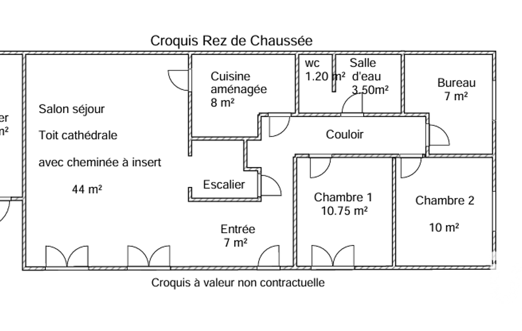 Au rez-de-chaussée, l’entrée dessert une belle pièce de vie de 43 m² bénéficiant d’une cheminée avec insert et d’un toit cathédrale, offrant une agréable luminosité. La cuisine est aménagée et entièrement équipée. L’espace nuit se compose de deux chambres et d’un bureau. Une salle de douches avec WC complète ce niveau. Une cave et une chaufferie sont accessibles directement depuis l’intérieur.