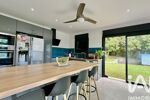 Dès l’entrée, la maison dévoile des espaces de vie lumineux et parfaitement agencés. La cuisine, largement ouverte sur l’extérieur grâce à ses baies vitrées, offre une vue dégagée sur le jardin et un accès direct à la terrasse et à la piscine. Le salon, plus intimiste, constitue un véritable cocon chaleureux. Le rez-de-chaussée accueille également une première suite parentale avec salle d’eau privative ainsi qu’un garage spacieux.