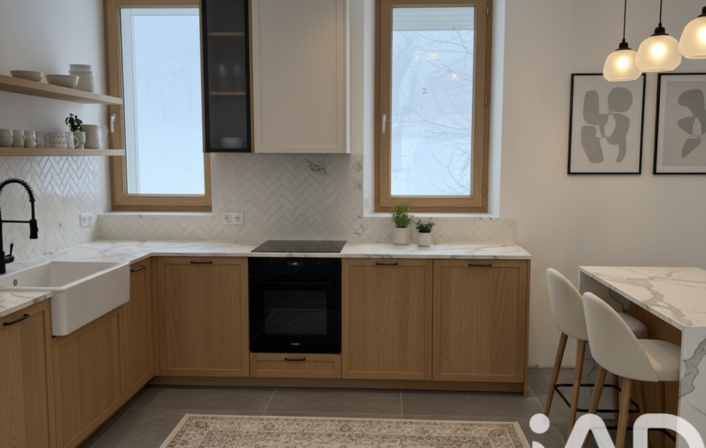 À l’entrée du village, cette maison mitoyenne rénovée en partie en 2022 de 73.5m2 carrez pour une surface au sol de 95m2 ( hors garage) est une toile blanche prête à accueillir vos idées.