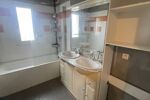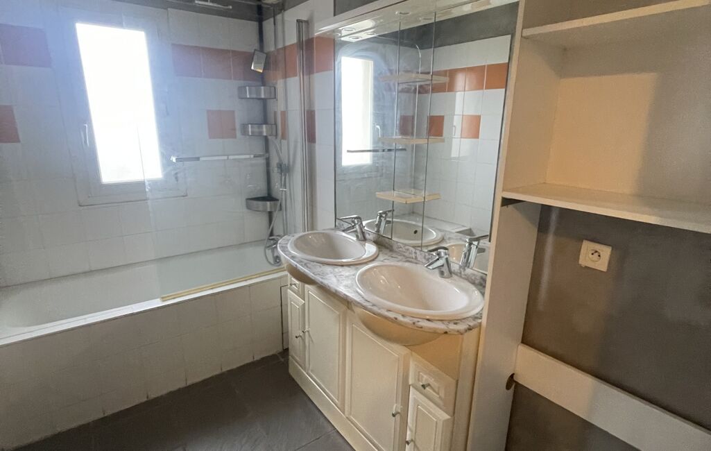 L’appartement offre deux grandes chambres avec placards, une salle de bains avec double vasque, des WC séparés, et une belle pièce de vie lumineuse.