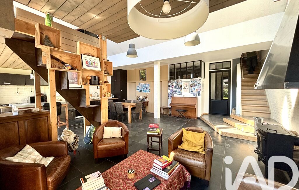 Au rez-de-chaussée , l'entrée s'ouvre sur une magnifique pièce de vie lumineuse avec un poêle à bois et une cuisine ouverte d'une surface d'environ 60m² ,vous y trouverez également un salon télévision séparé et une buanderie. Un escalier à pas japonais mène aux mezzanines ( dont une avec un coin douche ) servant actuellement de bureaux mais qui offrent de multiples possibilités.