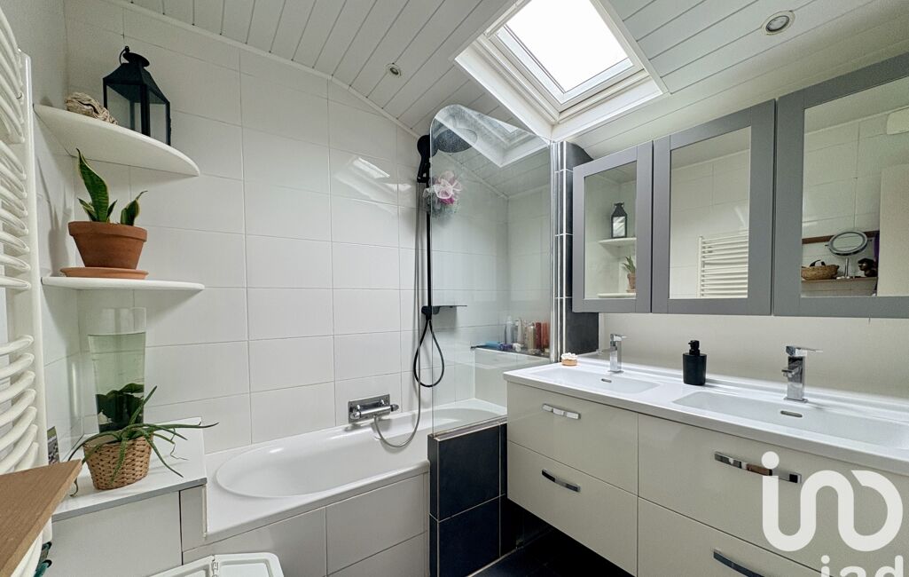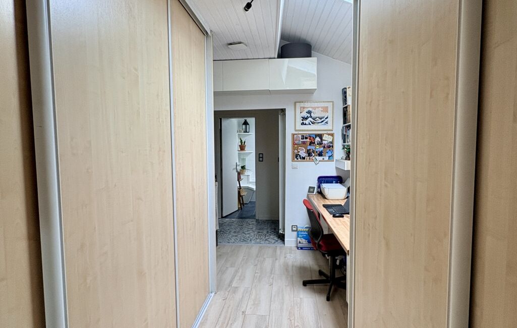 L'entrée composée de rangements, dessert une chaleureuse pièce de vie de 36 m2 avec une cheminée avec insert ouverte sur une cuisine aménagée et équipée. Vous trouverez ensuite une salle de bain avec meuble double vasque ainsi qu'un WC . Le côté nuit du RDC vous offre deux chambres de 11 et 12 m2 dont une avec salle d'eau privative. Pas de place de perdu puisque le large couloir a été aménagé en bureau et dispose de deux grands placards aménagés. Après avoir emprunté l'escalier qui mène à l'étage vous découvrirez