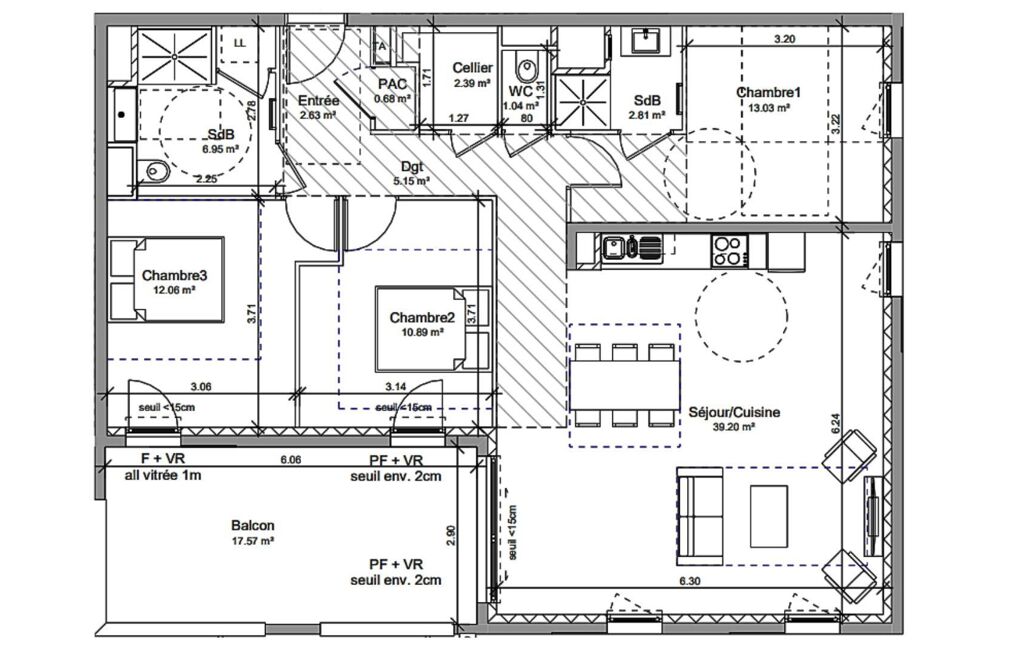 - Séjour/cuisine de 39 m² environ.