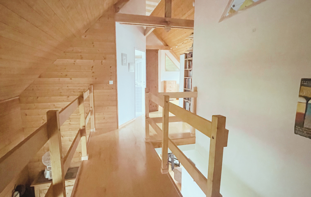 L’étage accueille trois chambres, une salle de bains, une mezzanine de plus de 20 m² et un grenier aménageable de 25 m², laissant place à de multiples projets.