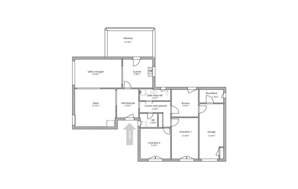 À l'intérieur, vous trouverez deux chambres, un bureau (aménageable en chambre), une buanderie, une cuisine équipée, un espace salon - salle à manger, une véranda, une salle d'eau comprenant un toilette et une douche à l'italienne, un WC séparé. La disposition des pièces est idéale pour une vie en toute quiétude, avec des matériaux de qualité et une attention particulière aux détails. De plus, la maison bénéficie de la climatisation pour un confort optimal en toutes saisons.