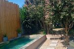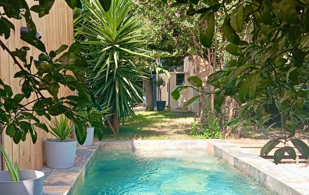 Il donne sur un magnifique jardin arboré avec arbres fruitiers et une superbe piscine en pierre de Bali de 5 m x 2 m, un vrai luxe en centre-ville.