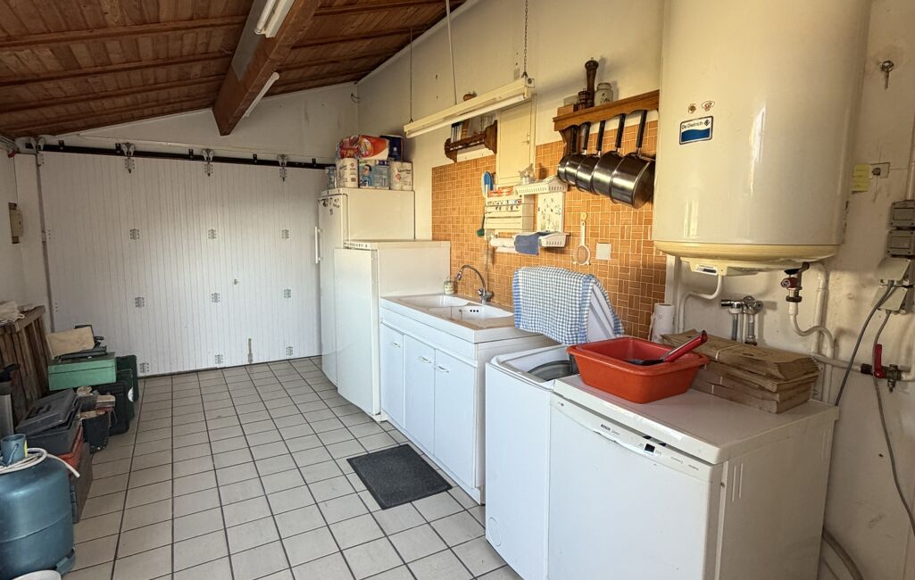 Un ancien garage a été intelligemment transformé en buanderie, apportant un espace fonctionnel supplémentaire, tandis qu’un garage indépendant complète le bien.