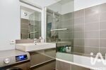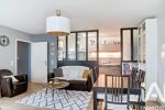 L’entrée avec rangements s’ouvre sur une pièce de vie lumineuse avec sa cuisine moderne équipée et élégamment séparée par une verrière contemporaine. L’ensemble se prolonge sur un premier balcon d’angle donnant sur de la verdure, parfait pour profiter de moments calmes.