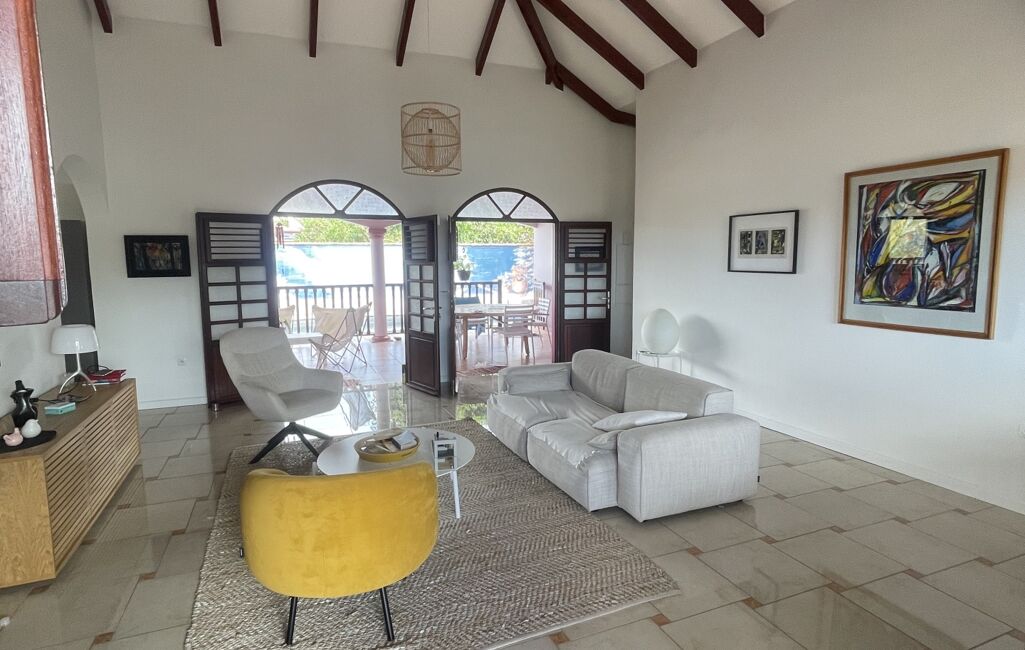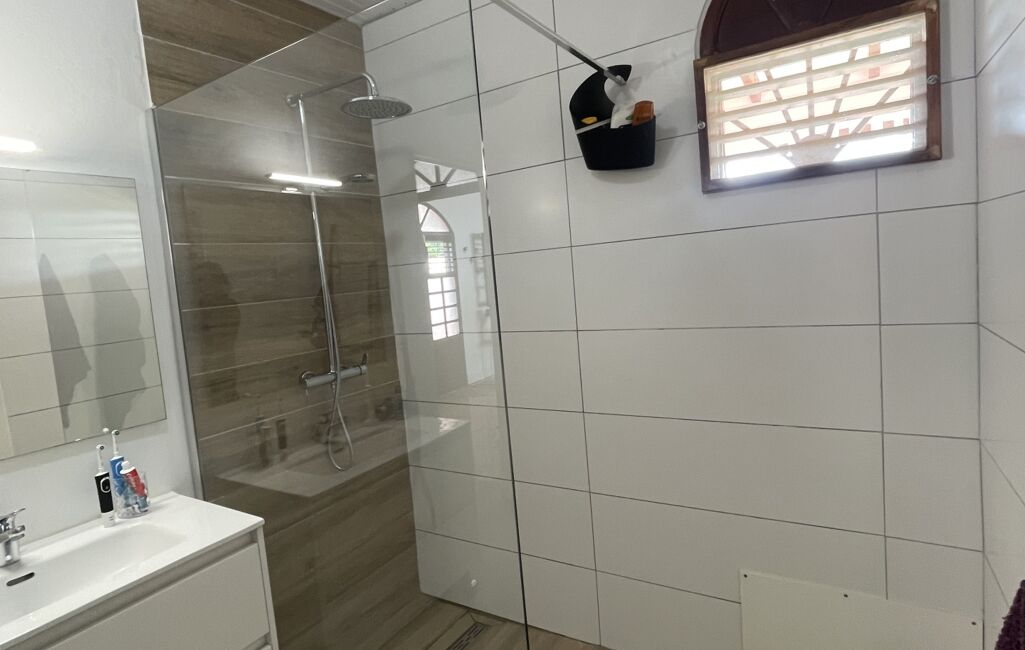 iad France - Sylvie Nathie vous propose: Secteur cité scolaire de RAMA Solide villa avec vue sur la Mer et le Rocher du Diamant - d'environ 120 m2 + 43 m2 de terrasses couvertes avec une toiture en tuiles, sous sol total, 1000m2 de terrain composée comme ceci, entrée sur la salle, une cuisine aménagée et équipée de qualité et quasi neuve, 2 chambres, 1 salle d’eau, 1 wc, 1 suite parentale - 1 piscine au sel , au sous sol - 1 chambre avec salle d’eau et wc, une cuisine , 1 atelier - récupérateur d'eau - portail électrique - Alarme - moustiquaires sur toutes les fenêtres - arbres fruitiers. A quelques minutes des plages de Sainte Luce et de la Nationale - A très vite pour une visite