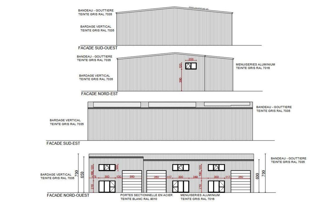 Structure métallique avec bardage double peau isolé, couverture panneaux sandwich compatible photovoltaïque, éclairage industriel LED et alimentation électrique triphasée 36 kVA.