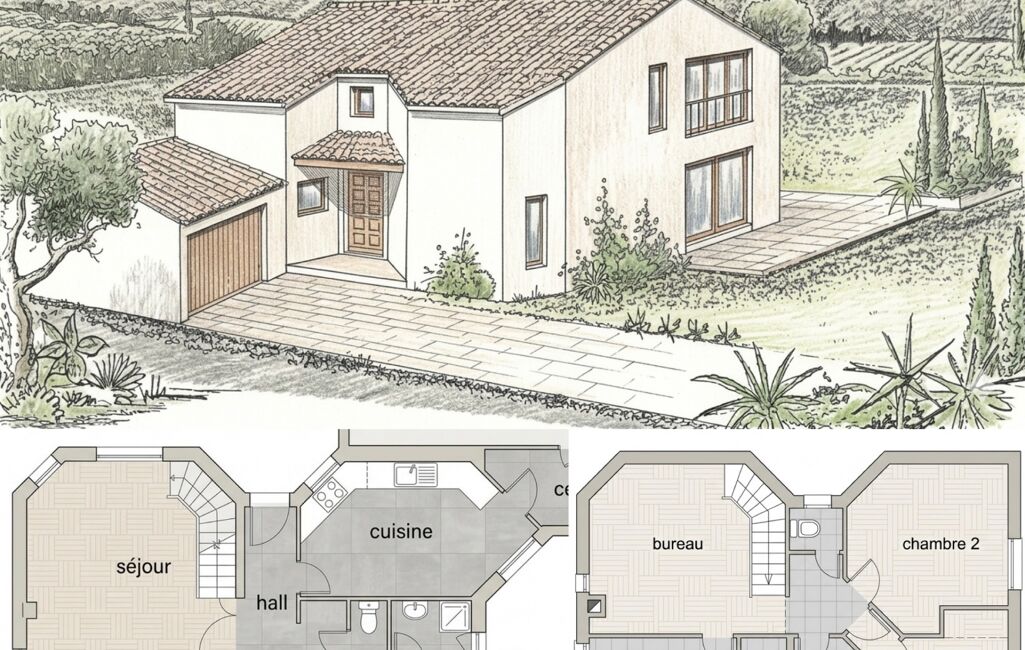 Elle se compose d’un salon-séjour lumineux de plus de 35 m², d’une cuisine indépendante avec cellier et accès garage (20 m²), ainsi que d’une suite parentale de plain-pied ouvrant sur le jardin. WC avec lave-mains.