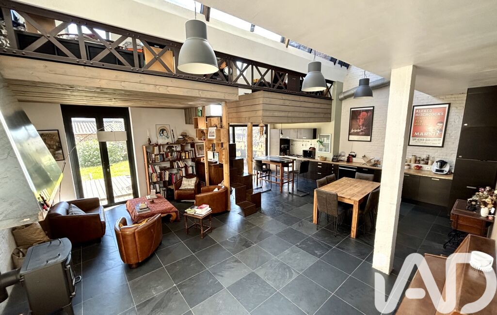 Au rez-de-chaussée , l'entrée s'ouvre sur une magnifique pièce de vie lumineuse avec un poêle à bois et une cuisine ouverte d'une surface d'environ 60m² ,vous y trouverez également un salon télévision séparé et une buanderie. Un escalier à pas japonais mène aux mezzanines ( dont une avec un coin douche ) servant actuellement de bureaux mais qui offrent de multiples possibilités.
