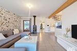 Le rez-de-chaussée s’ouvre ensuite sur un vaste salon lumineux, sublimé par un magnifique mur en pierre apparente qui apporte tout le charme et l’authenticité de la bâtisse.