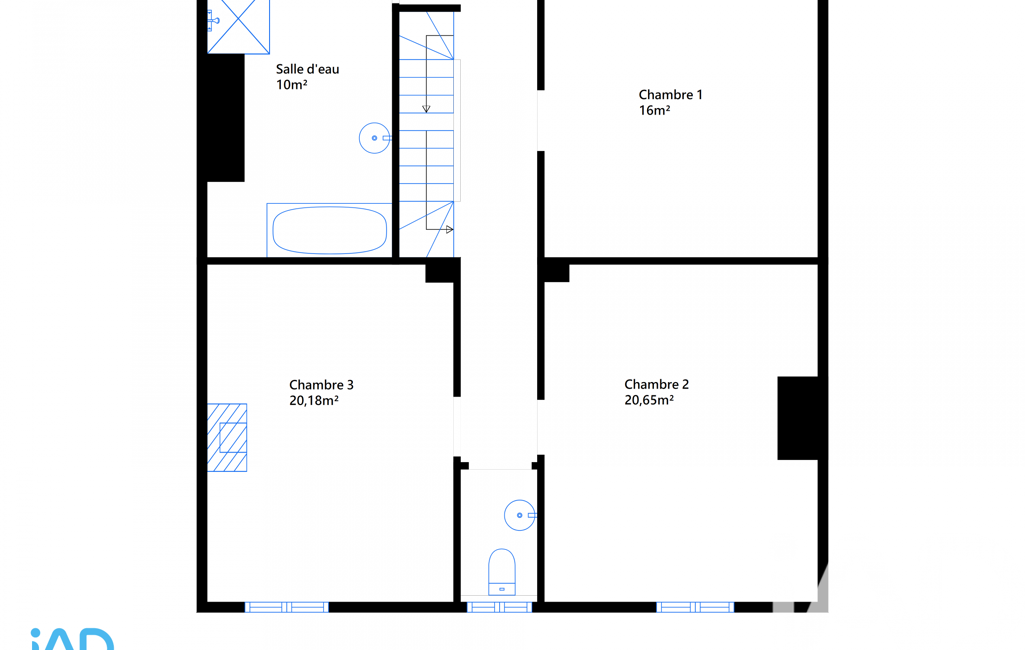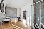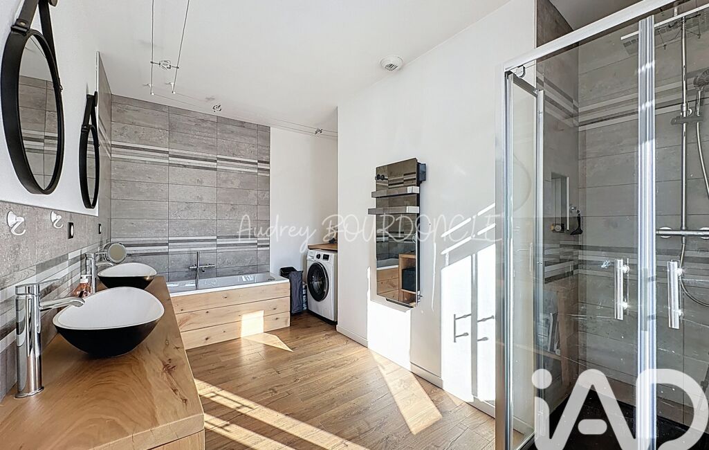 À l’étage, la maison offre trois grandes chambres et une salle d’eau complète avec cabine de douche, baignoire et meuble double vasque, un wc séparé.