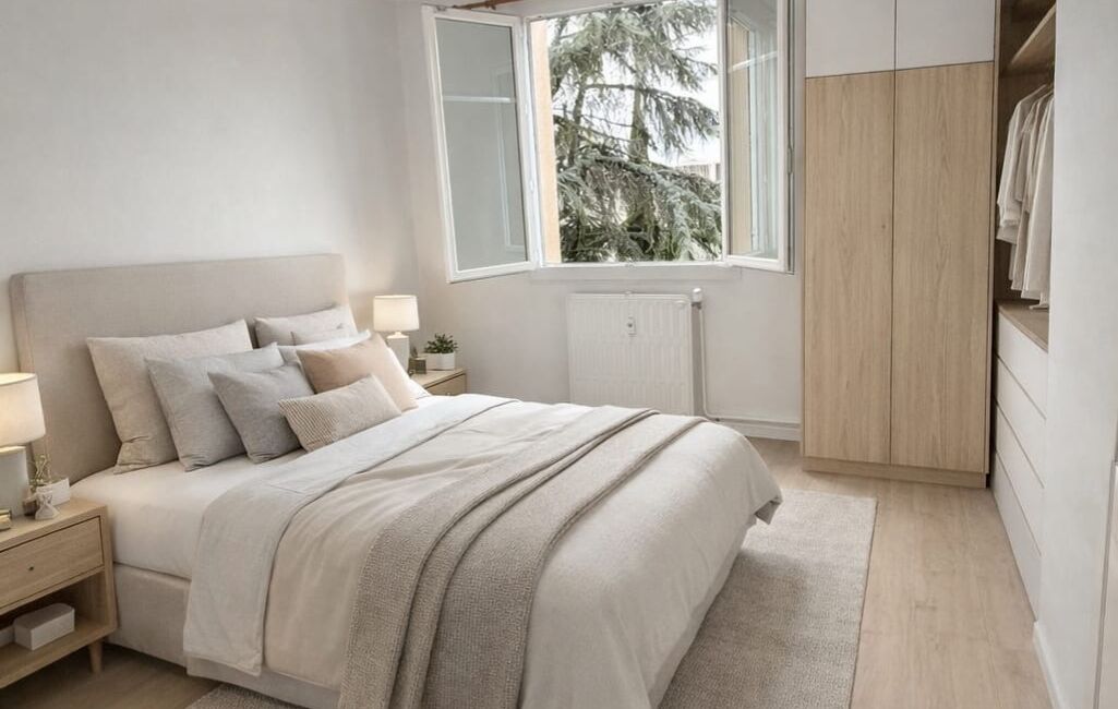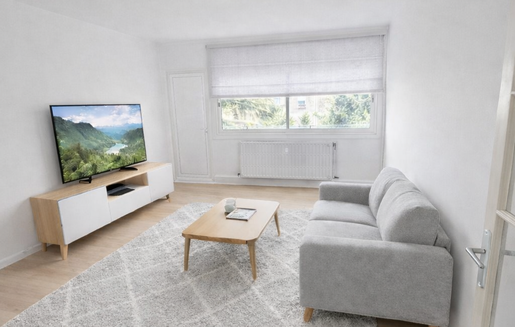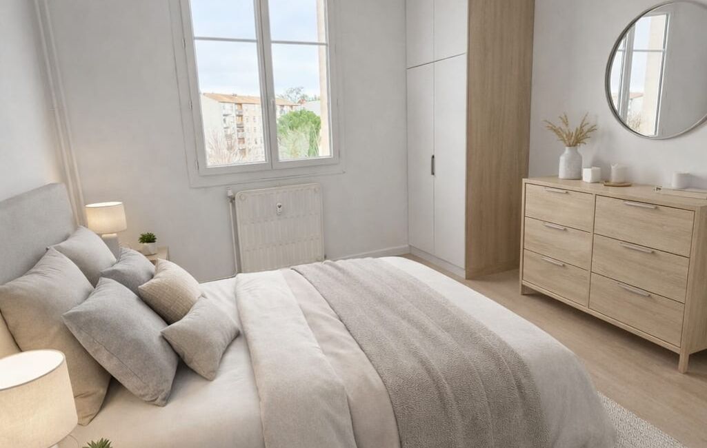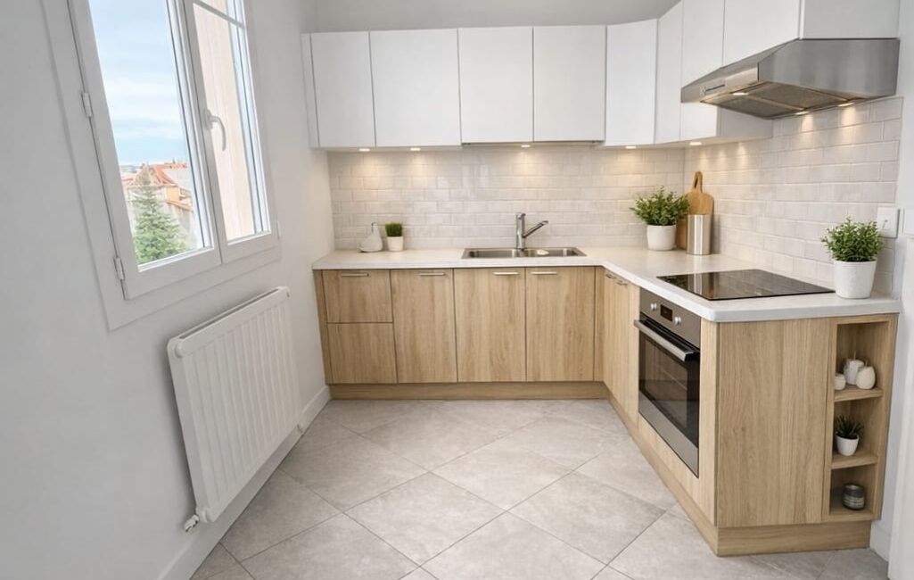 Je vous propose du home staging généré par l'IA sur la cuisine, le séjour et les 2 chambres.