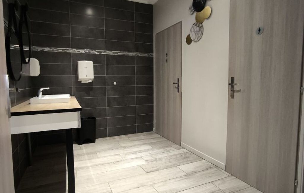 Il comprend également un espace bar, une cuisine professionnelle équipée, une plonge, une légumerie, trois réserves, une chambre froide, un bureau ainsi qu'un sous-sol. Les toilettes sont conformes aux normes PMR.