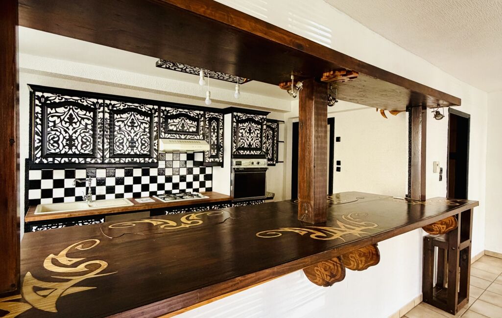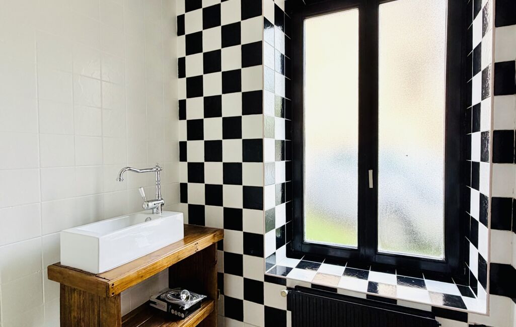 La cuisine, actuellement aménagée, présente un agencement et des choix de couleurs atypiques, laissant la possibilité aux futurs acquéreurs de la repenser selon leurs envies pour créer un espace à leur image.