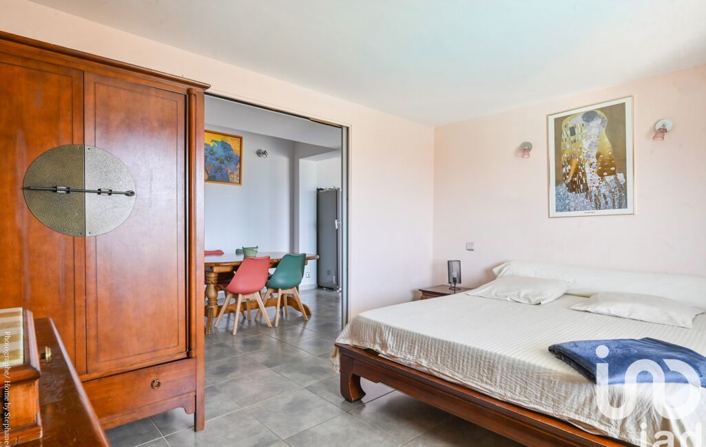 La pièce de vie de 70m² baignée de lumière et décorée avec goût, cheminée insert et climatisation gainable s'ouvre sur une large terrasse exposée sud vue mer et Cap Canaille,