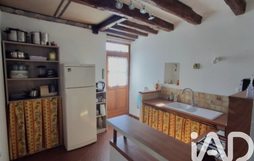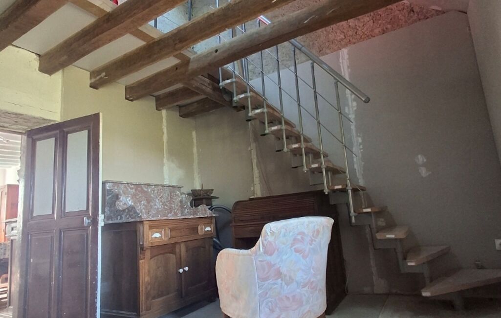 Au RDC : séjour tomettes et poutres avec cheminée insert tubée, cuisine aménagée, une pièce bureau/salon, salle d'eau avec WC.