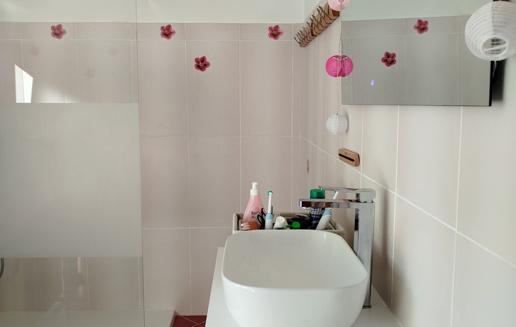 Dès l’entrée, le rez-de-chaussée propose une vie avec un bel espace de vie d’environ 42 m² comprenant salon, cuisine et salle à manger, idéal pour partager des moments conviviaux. Une chambre avec grands placards, ainsi qu’une salle d’eau avec WC complètent ce niveau.