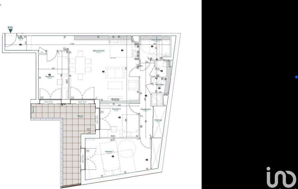 Trois chambres bien séparées pour préserver l’intimité de chacun. Deux salles d’eau élégantes, dont une suite parentale avec dressing. Un balcon filant prolonge les pièces de vie vers l’extérieur, avec une vue dégagée.