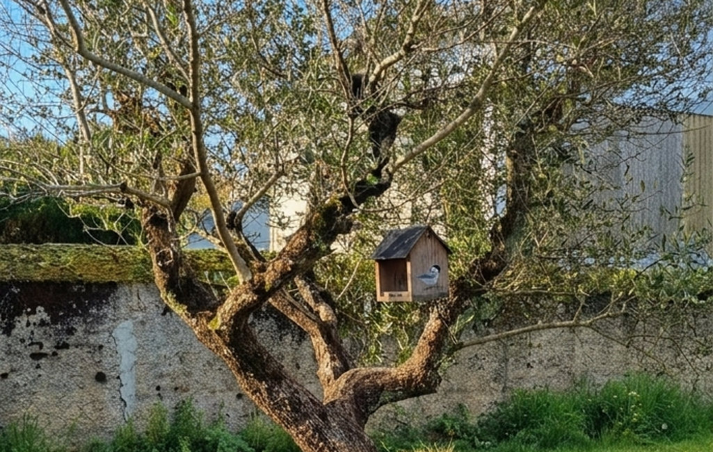 Une grande cour fermée avec un abris pour garer les voitures.