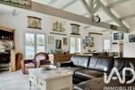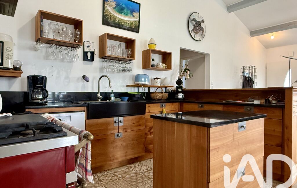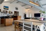 L’espace s’ouvre naturellement sur une cuisine aménagée et équipée haut de gamme, réalisée en merisier, dotée d’une cuisinière Lacanche et d’un plan de travail en granit, pensée pour les amateurs de beaux matériaux et de convivialité.