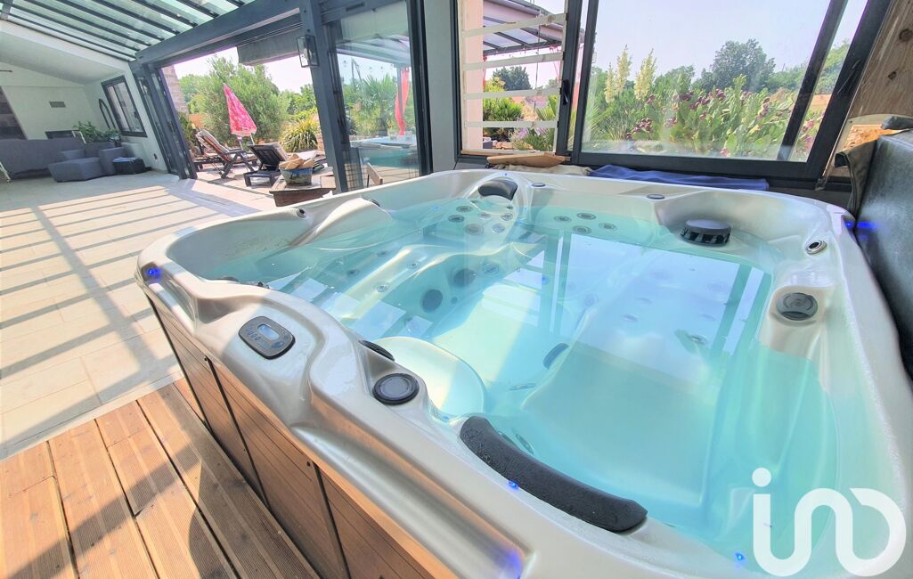 La pièce de vie, de 60 m² environ, avec cheminée insert double face, ouvre sur la pièce d’eau de 112 m² environ avec piscine, jacuzzi et hammam.
