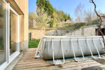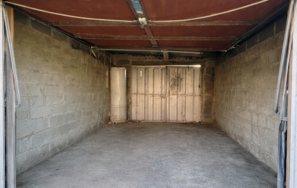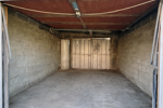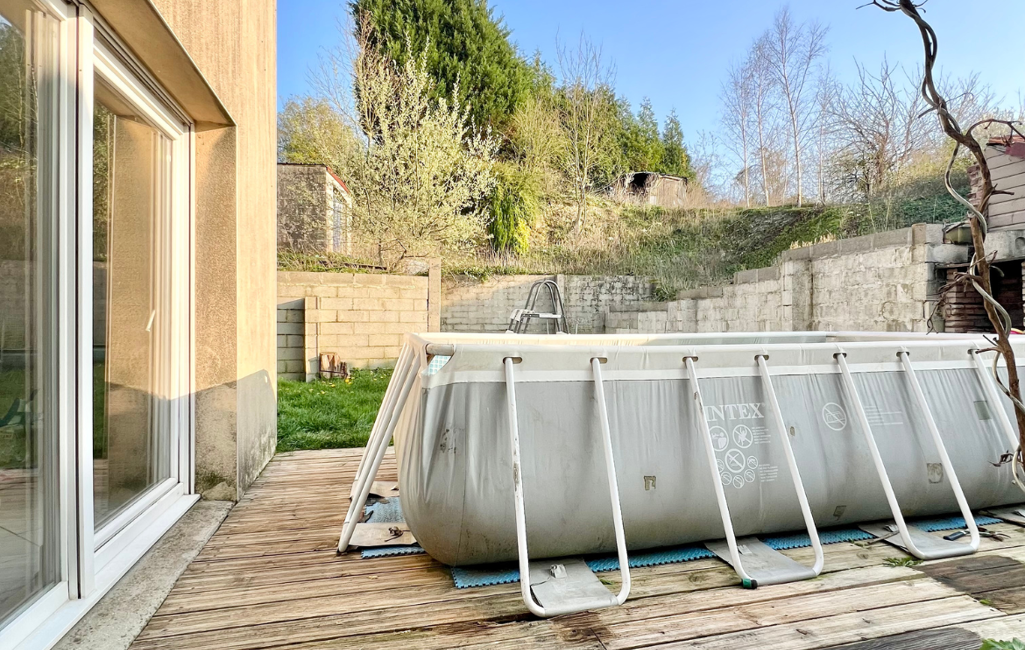 Côté extérieur, une terrasse en bois (avec dalle béton dessous) bien exposée donnant sur le jardin arboré, un espace de stationnement sur l'avant et un garage avec porte manuelle.