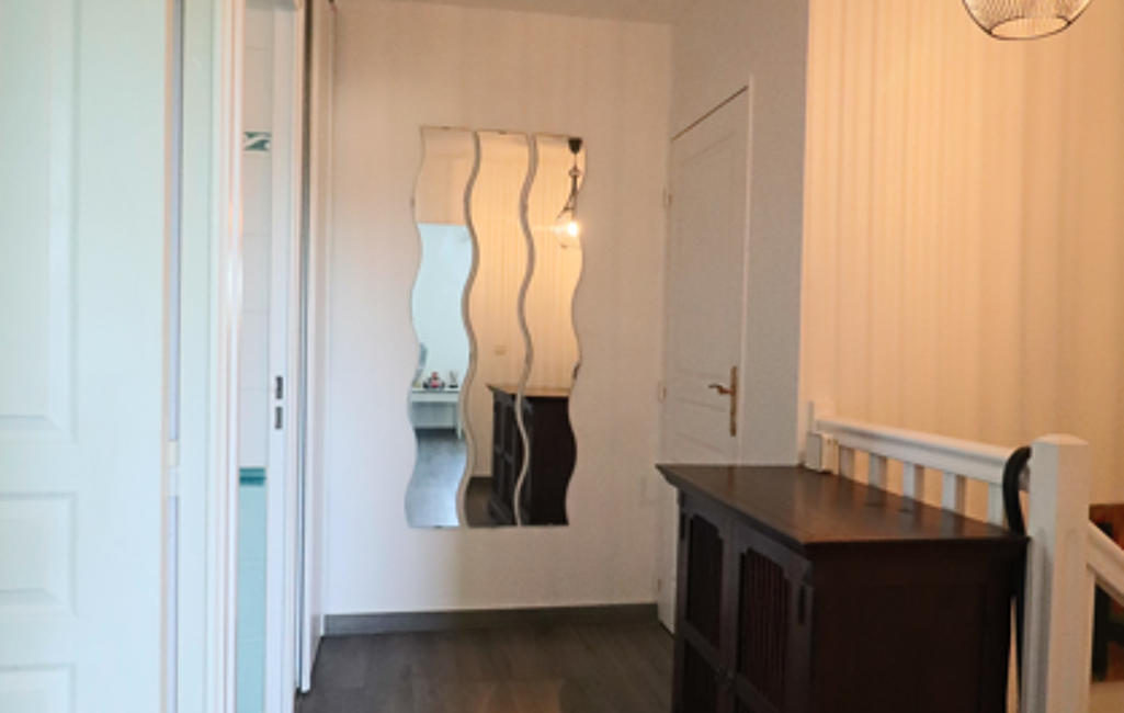 Un dégagement avec placard/penderie dessert 2 chambres de 12 et 14m² avec double placard/penderie dont une avec climatisation, une salle de bains avec cabine de douche et sèche serviette ainsi qu'un wc indépendant avec lave-main.