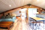 - 'L'Oustal' : Appartement indépendant avec 1 cuisine d'appoint aménagée et équipée (réfrigirateur, plaque de cuisson, lave-vaisselle, lave-linge, sèche-linge) ouverte sur 1 grand salon donnant sur un balcon (coin table et chaises) avec TV, canapé convertible (2 personnes), 1 chambre pour 2 personnes, 1 chambre avec 2 lits superposés et 1 petit-lit, charpente bois poutres apparentes, 1 salle de bain (baignoire, lavabo + miroir, sèche-serviettes), 1 wc indépendant