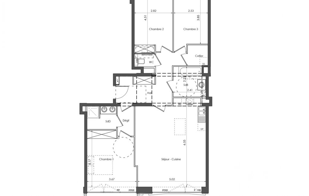 L’appartement comprend une entrée avec placard, un vaste séjour lumineux avec cuisine équipée, 3 chambres dont une suite avec salle de douche et balcon, une salle de bain, des WC séparés et un espace buanderie.