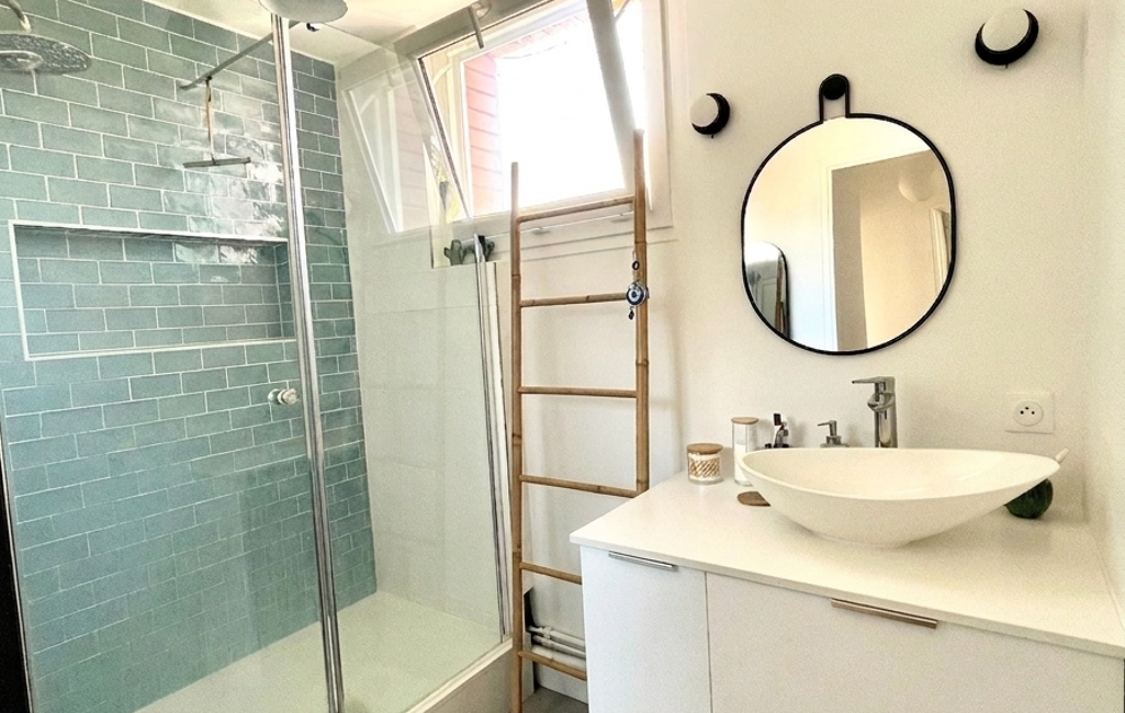 L'espace nuit se compose de deux belles chambres avec rangements, une salle d'eau avec fenêtre, un WC séparé. Les volets sont en PVC électriques dans les chambres. Le tableau électrique a été refait et le ballon d'eau est récent.