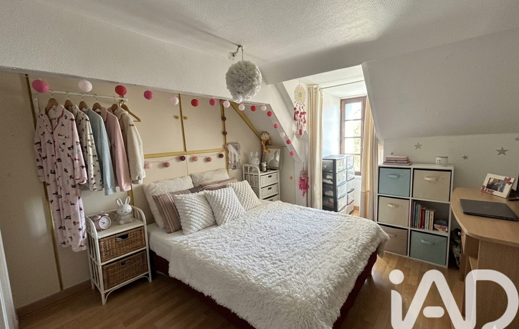 À l’étage, on retrouve une chambre avec des placards, un bureau et un espace grenier.