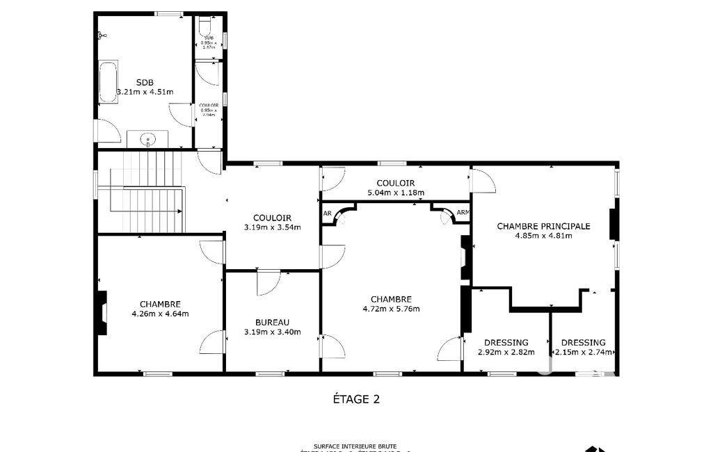 Un escalier en bois massif mène à l’étage, où se trouvent trois chambres, dont deux avec dressing, un bureau d’environ 10 m², ainsi qu’une spacieuse salle de bain équipée d’une douche à l’italienne et d’une baignoire.